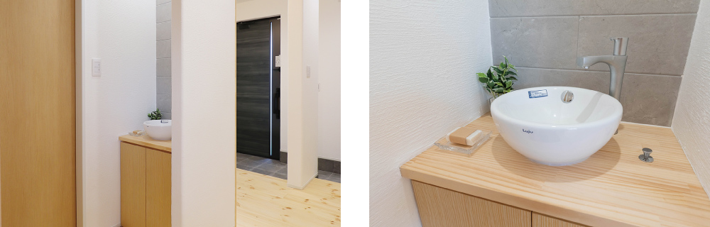 帰宅時、シュークロを通って早く短い動線で手洗いが出来る洗面を設置。