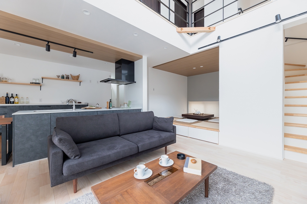 リビング横には、小上がりの畳スペースをご用意。下部には引き出し収納を設けて、しっかり収納できる工夫がされています。