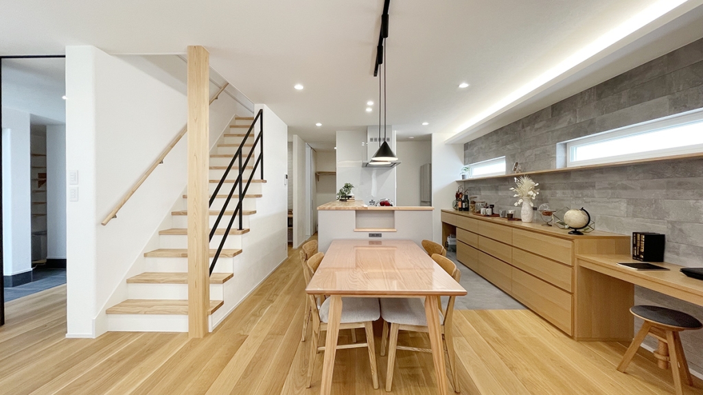 キッチン横にはご家族共有のカウンタースペースを設置。お子様と読書をしたり、宿題を一緒に見てあげたり…。ご家族が自然と集まり、笑顔あふれる生活が想像できる住まいです。