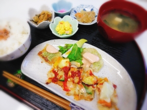 ・メイン 彩り野菜とお肉のピザ仕立て&タラのパン粉焼き