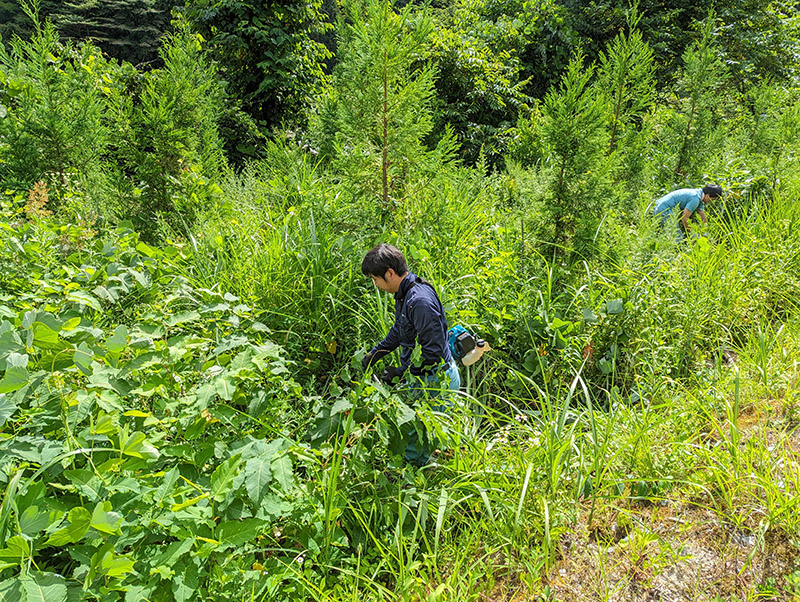 無花粉スギの苗木「立山森の輝き」を植樹して以来、苗木が大きくなるまで毎年下草刈りを行っています。