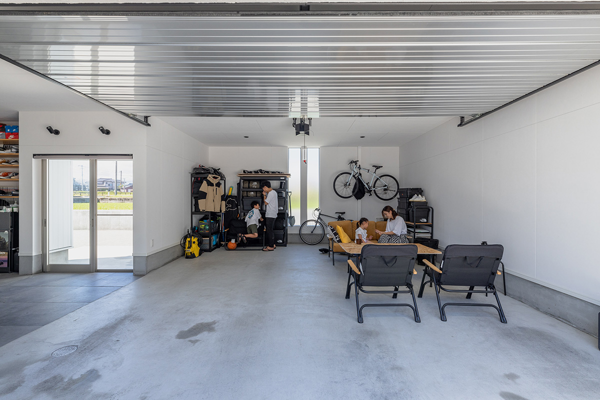 広々としたインナーガレージは、車を収納するだけではなく、家族全員が楽しめる空間に変身。休日にはソファとテーブルを並べて、ガレージ飯を楽しんだり、プロジェクターでテレビを楽しんだりしています。天候に左右されることなくアウトドア気分を満喫でき、家族が集まる特別な場所として大活躍。ガレージの使い方に新たな魅力が広がります。