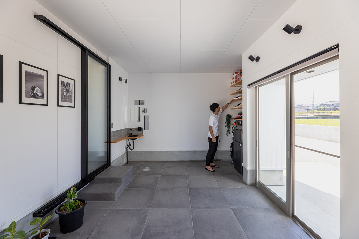 ガレージにはご主人専用のお部屋を設け、冷蔵庫や手洗いも完備され、友人との宅飲みも家族に気兼ねなく楽しめます。自分の趣味を存分に楽しめる空間には、スニーカーをディスプレイできるコーナーも。ガレージをただの収納スペースとしてではなく、ライフスタイルに合わせた快適な趣味空間として活用することで、日々の生活にさらに満足感をプラスしています。