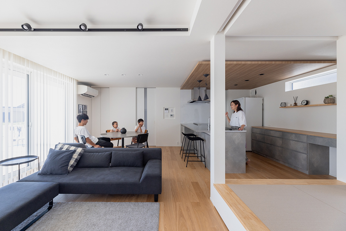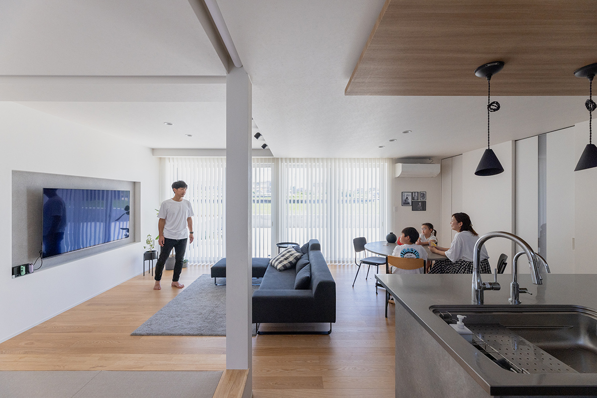 このLDKは、色味を抑えてコーディネートされたシンプルなデザインが特徴です。ナチュラルなトーンの木材や、穏やかな色合いの壁面が調和し、落ち着いた空間を作り出しています。余計な装飾を省き、シンプルながらも洗練された雰囲気に仕上げることで、家族が長時間くつろげる心地よい空間が完成しました。シンプルだからこそ、インテリアや家具が引き立ち、温かみのある空間を実現しています。