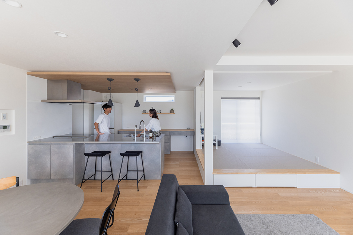 オープンキッチンには、配膳がしやすいカウンターを設け、家事動線を考えた便利な設計に。料理を作りながら、ダイニングとの距離も近く、配膳もスムーズに行えます。カウンターは、家族が集まりやすい場所としても活用でき、リビングやダイニングで過ごす時間をより一層心地よく演出。シンプルでありながら機能性を兼ね備えたデザインが、毎日の暮らしを豊かにします。