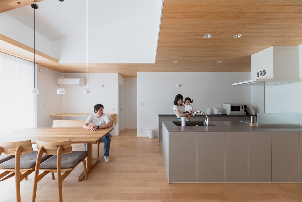 キッチンとダイニングがゆるやかにつながる、家族の会話が弾むオープンな空間。グレートーンのアイランドキッチンは落ち着きがあり、木の天井や床と調和してやさしい雰囲気に。家族の気配を感じながら料理や家事ができ、安心感と暮らしやすさが魅力です。