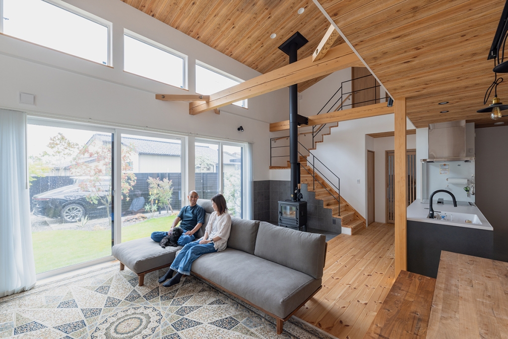 吹き抜けのリビングに設けられた薪ストーブは、空間の主役。冬は家中を優しく暖め、家族の団らんを自然と引き寄せる存在です。床・天井・梁には温もりある木材をふんだんに使用し、視覚からも暖かさを感じられます。窓を大きく設けたことで明るさと開放感が生まれ、日中は陽光が部屋全体をやさしく包み込みます。天井高を活かした縦の広がりと、木の質感が調和することで、季節ごとに表情を変える心地よい空間が完成しました。